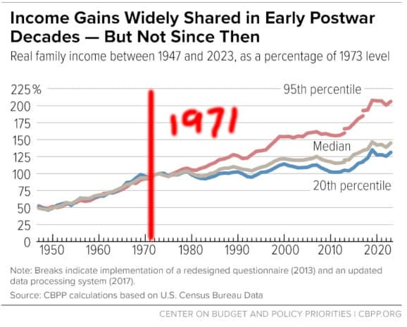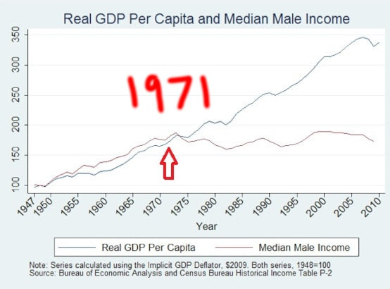 Lest you doubt the validity of this 1971 oddity, you should be aware that I’m not the first one to point it out. Not only has the economic and social disconnect that seemingly happened that year become the stuff of online discussion, debate and political memes for years now, it has even filtered down to the normiest website on the internet, Reddit.