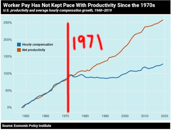 Directly or indirectly, de-tethering the dollar from gold and opening the fiat money floodgates led to all of the other economic and societal shifts that we can trace back to that 1971 inflection point. And that’s what happened in 1971.